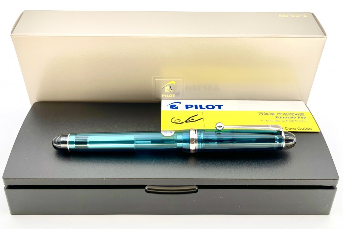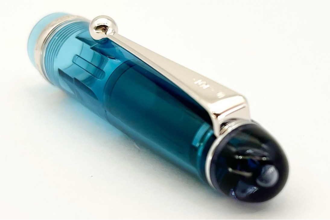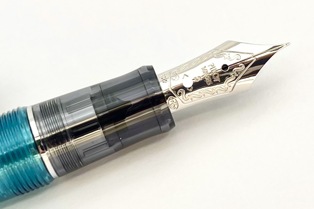 The Pilot Custom 74 Transparent fountain pen is a round ended pen with transparent body with smokey clear tip and end. The transparent demonstrator body and cap nicely shows off the pen's inner workings. Each Custom 74 demonstrator fountain pen is finely crafted with a high-capacity, Pilot CON-70 push-button converter, which holds an ample ink supply while uniquely combining the characteristics of a vacuum-filling and push-button converter. The clip and trim are plated in bright rhodium. The Pilot Custom 74 features a solid gold 14k rhodium-plated nib. It is a size #5 nib which is the same nib size as the Pilot Custom Heritage 91. Available in 3 nib sizes: fine, medium, and broad.