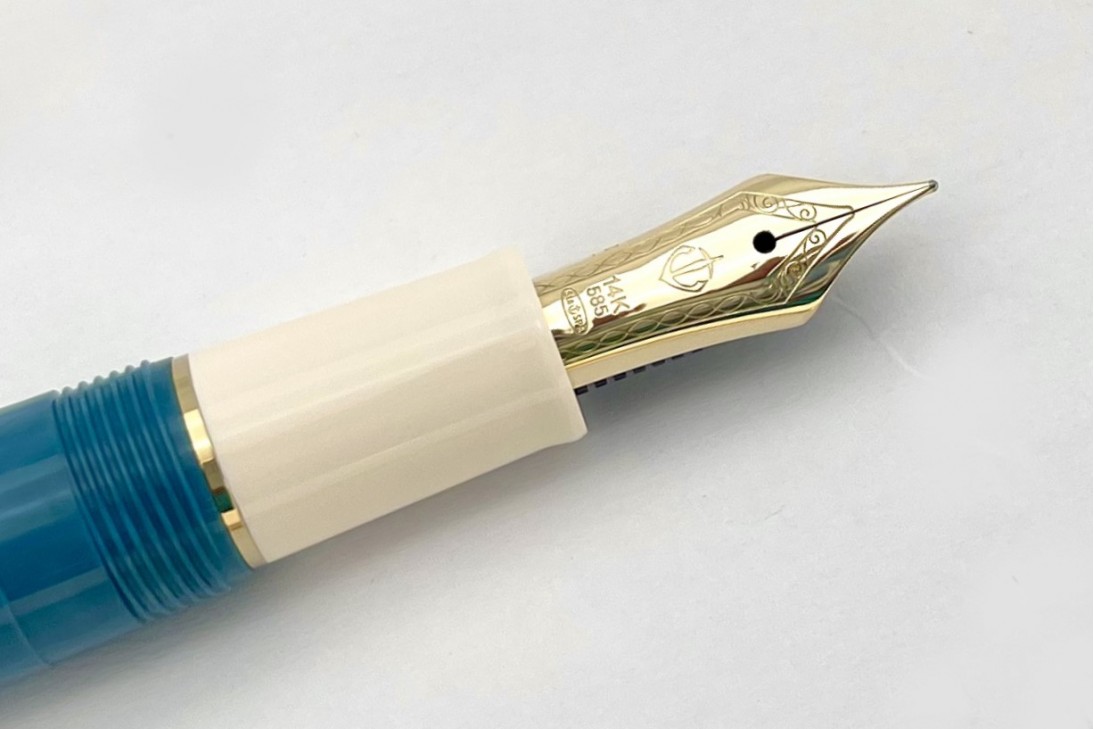 Rencontre is French for "encounter" and the name follows suit: Bleu Ciel means "Sky Blue." This series embodies the encounter between acrylic resin which offers transparentness and durability, with the elegant texture of marble patterns, born of Sailor's original technique. The marble patterned barrel is the iconic characteristic of this series and is manufactured with the injection molding method we normally employ for resin parts. Only under limited conditions can two colors form a beautiful marble pattern without blending too much into each other. Marble forming techniques have existed, but it was always considered difficult to create marble patterns with acrylic resin.
