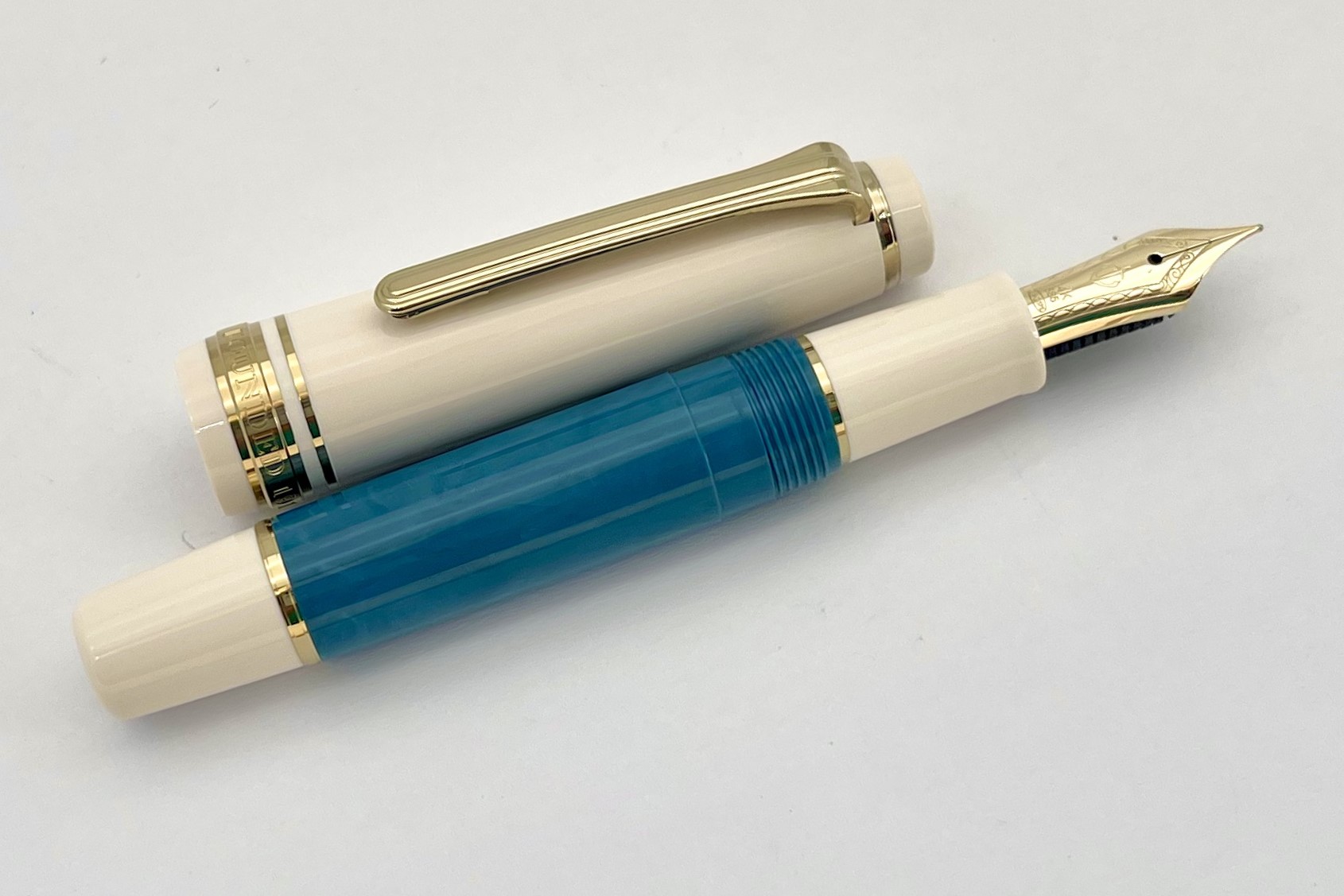 Sailor introduces a new look in its popular Slim Mini model with the new Rencontre series. Featuring a marbled blue resin body and a white cap and finial, and is complemented by gold-plated accents. The flat top cap features the Sailor anchor logo inset into the top finial.