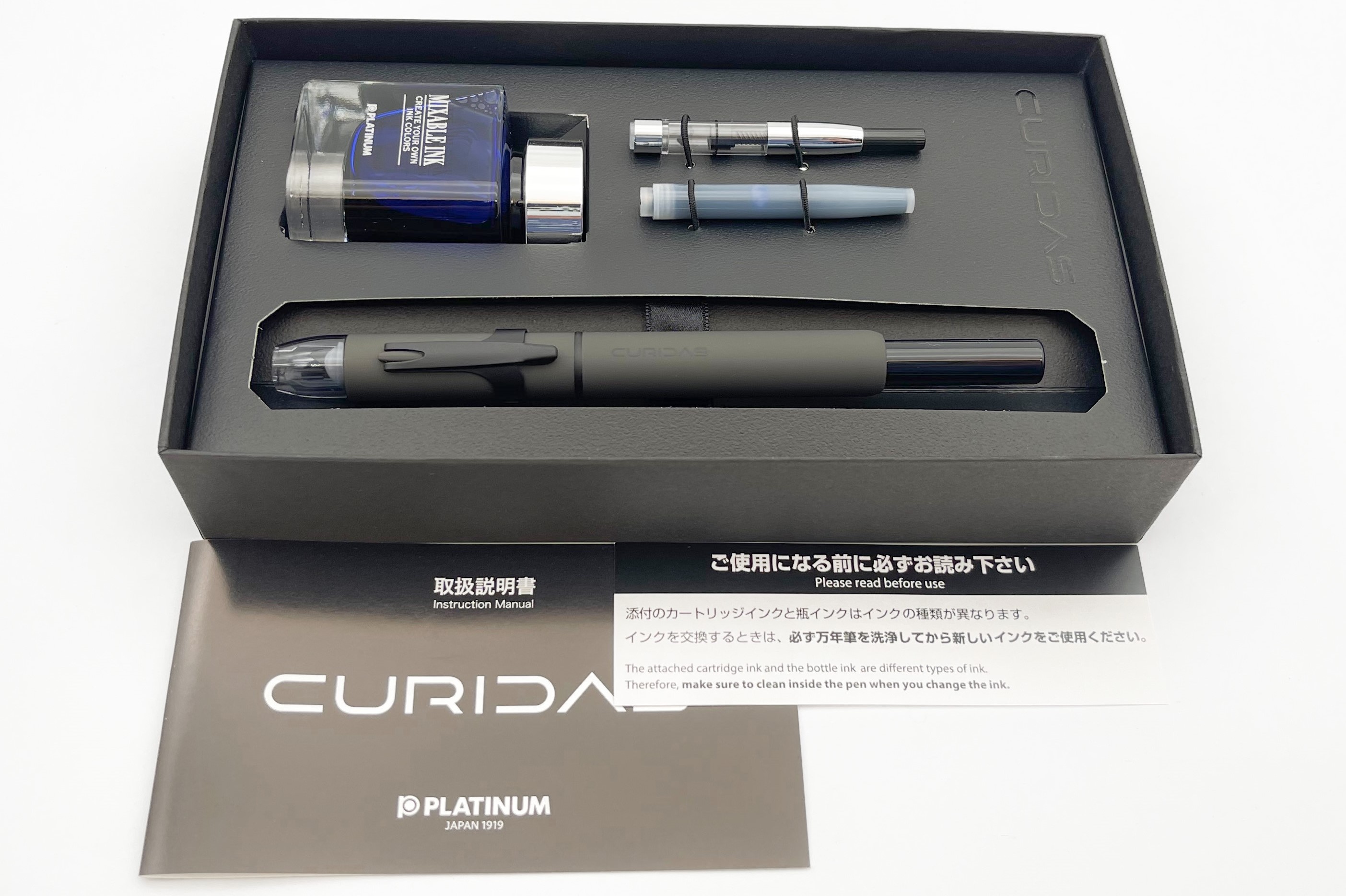 This limited edition package set includes a Platinum Curidas fountain pen in a steel nib, a 20ml bottle of ink, an ink cartridge, and a converter.