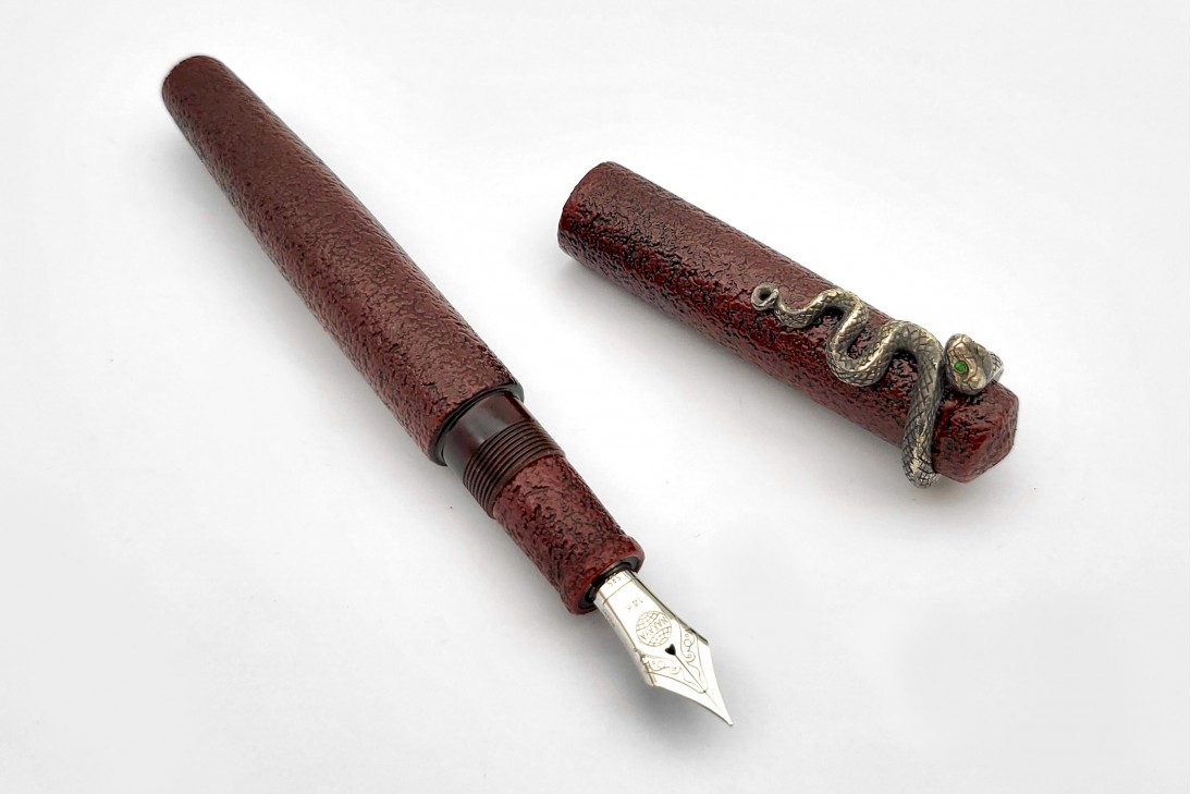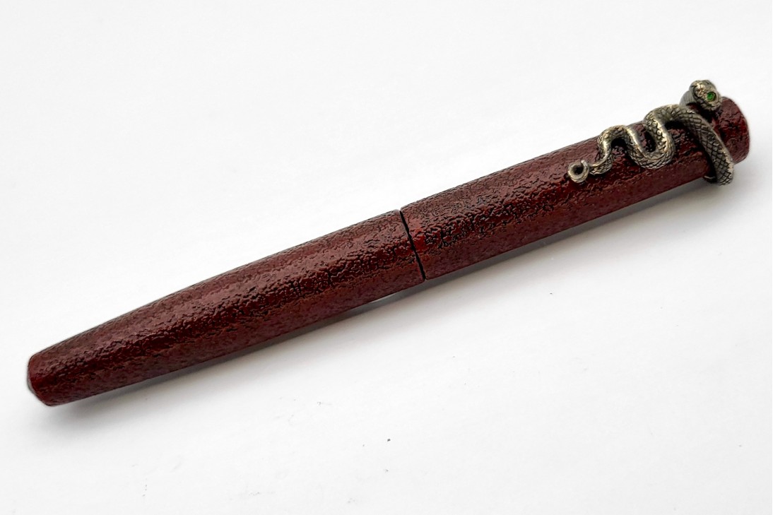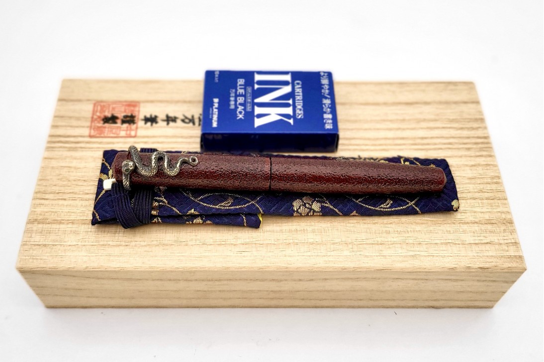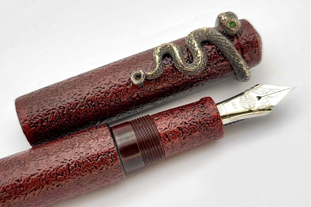 Nakaya Piccolo Long Writer Ishime Kanshitsu Kuro-Tamenuri Fountain Pen with Snake Stopper with Emerald Eyes