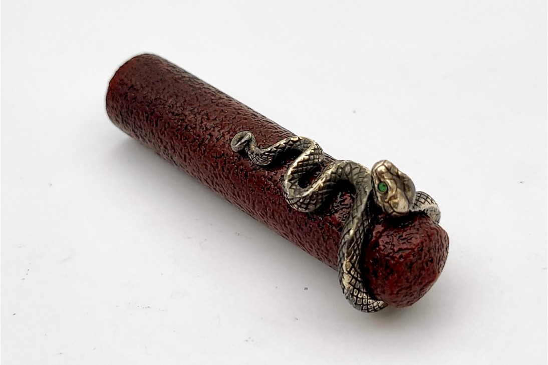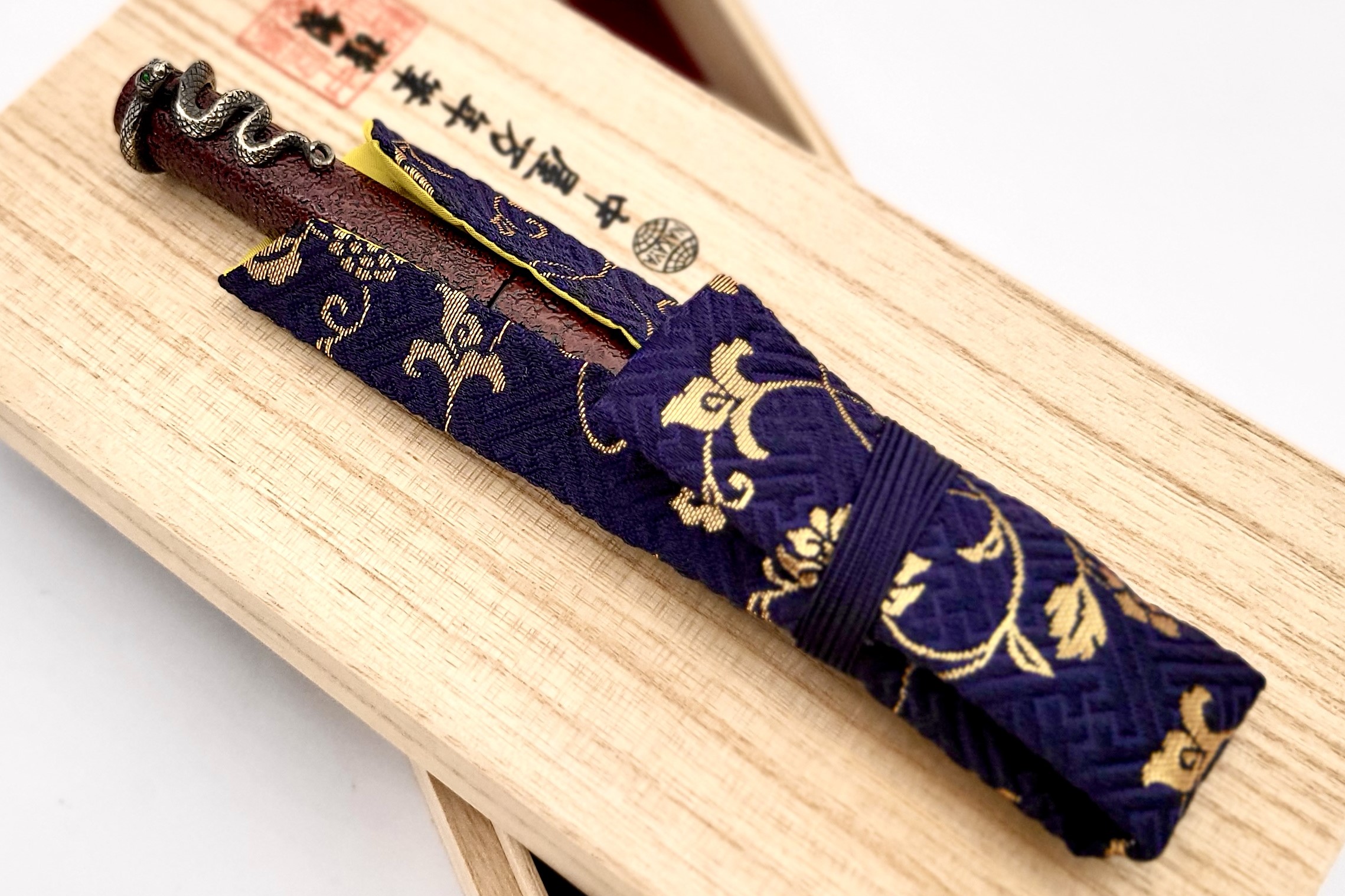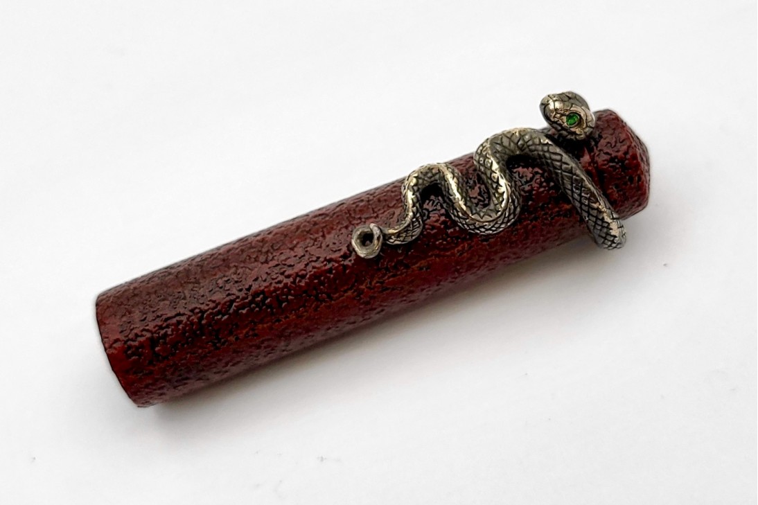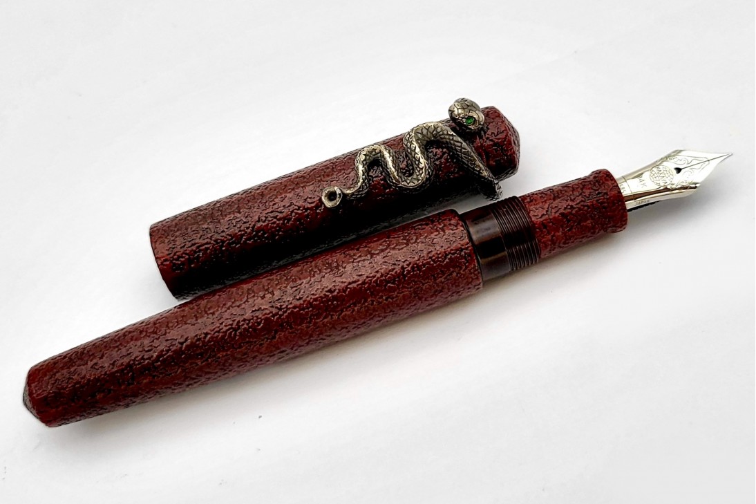 Nakaya Piccolo Long Writer Ishime Kanshitsu Kuro-Tamenuri Fountain Pen with Snake Stopper with Emerald Eyes