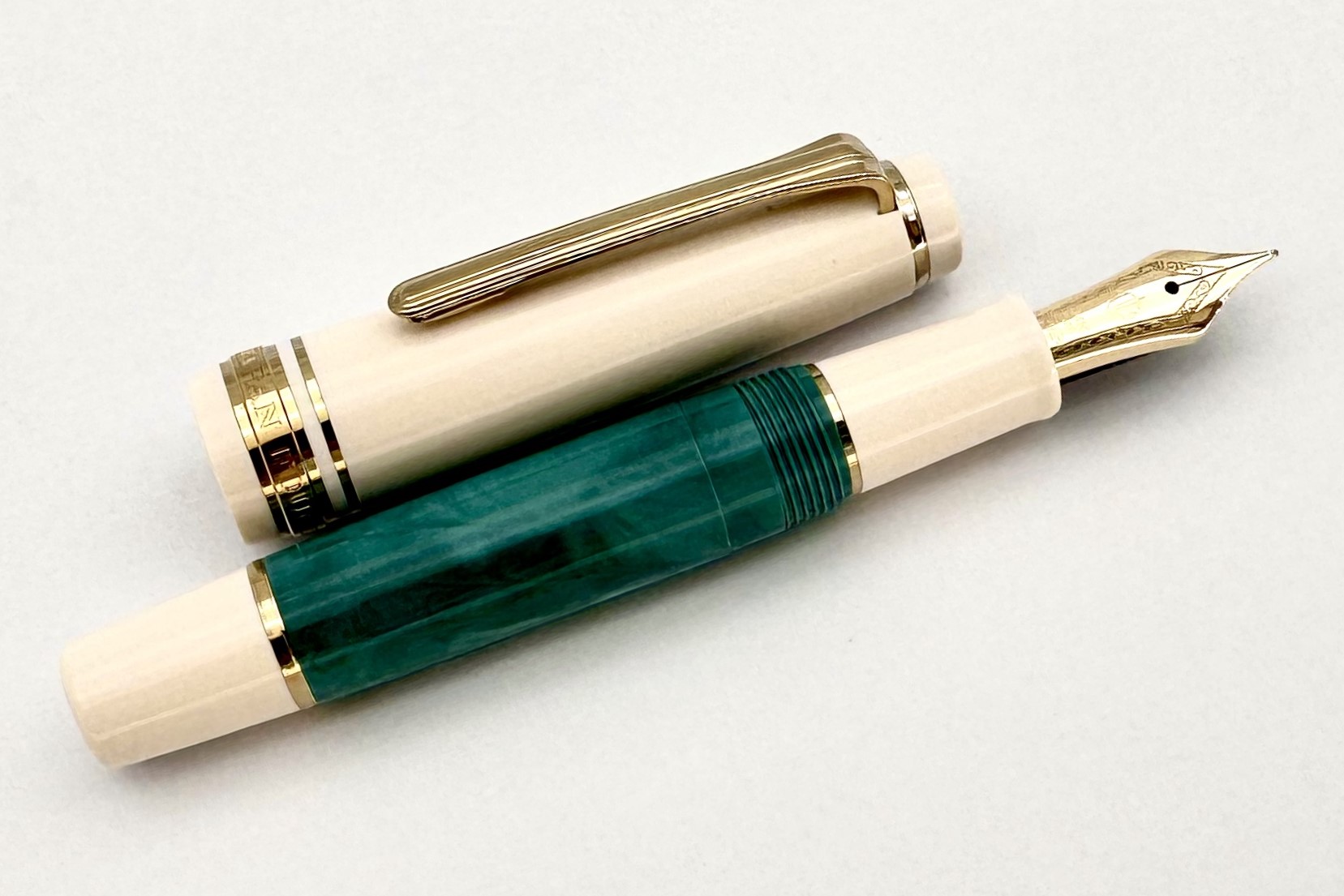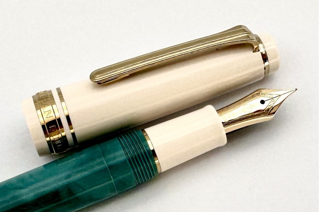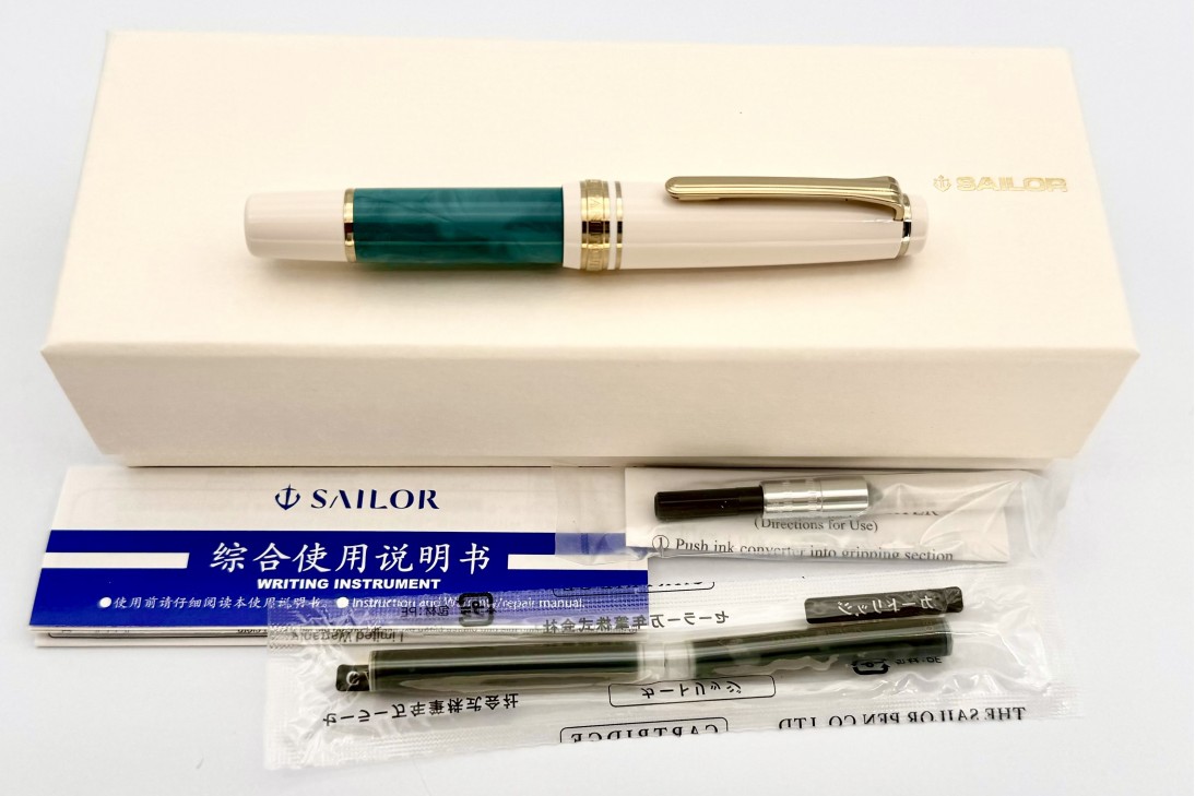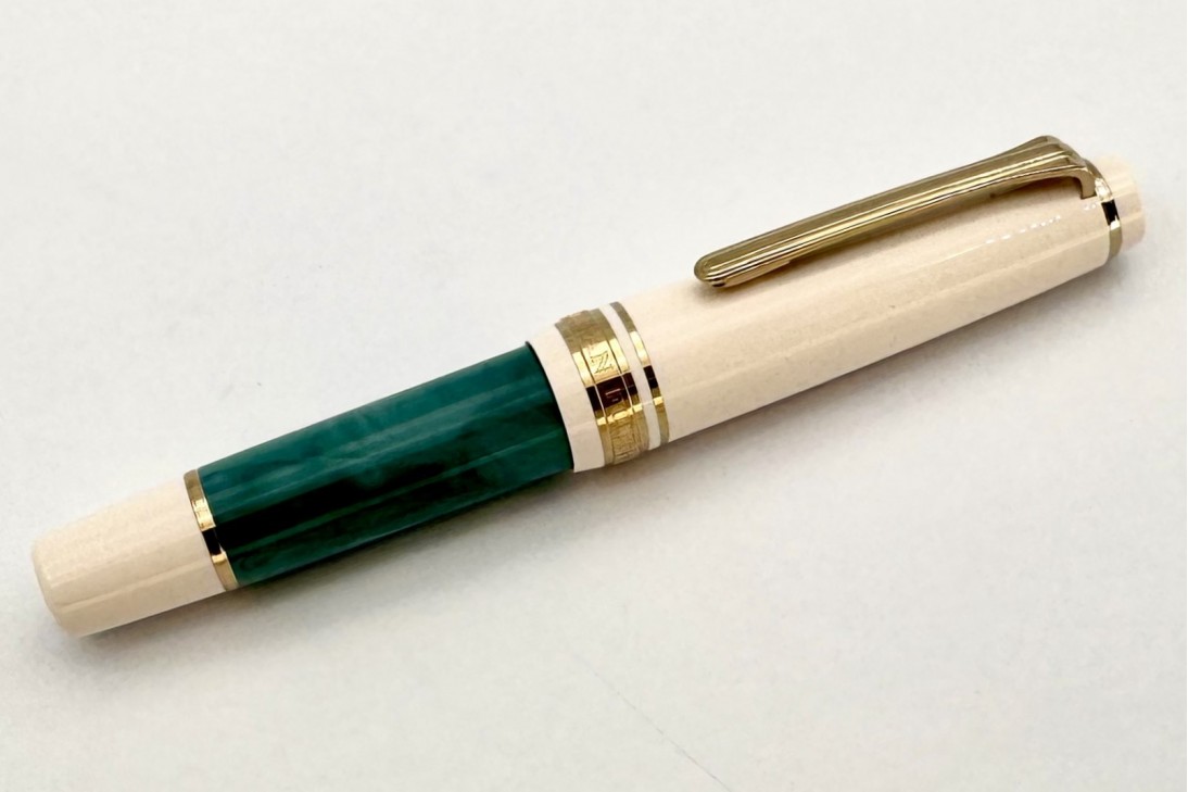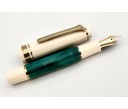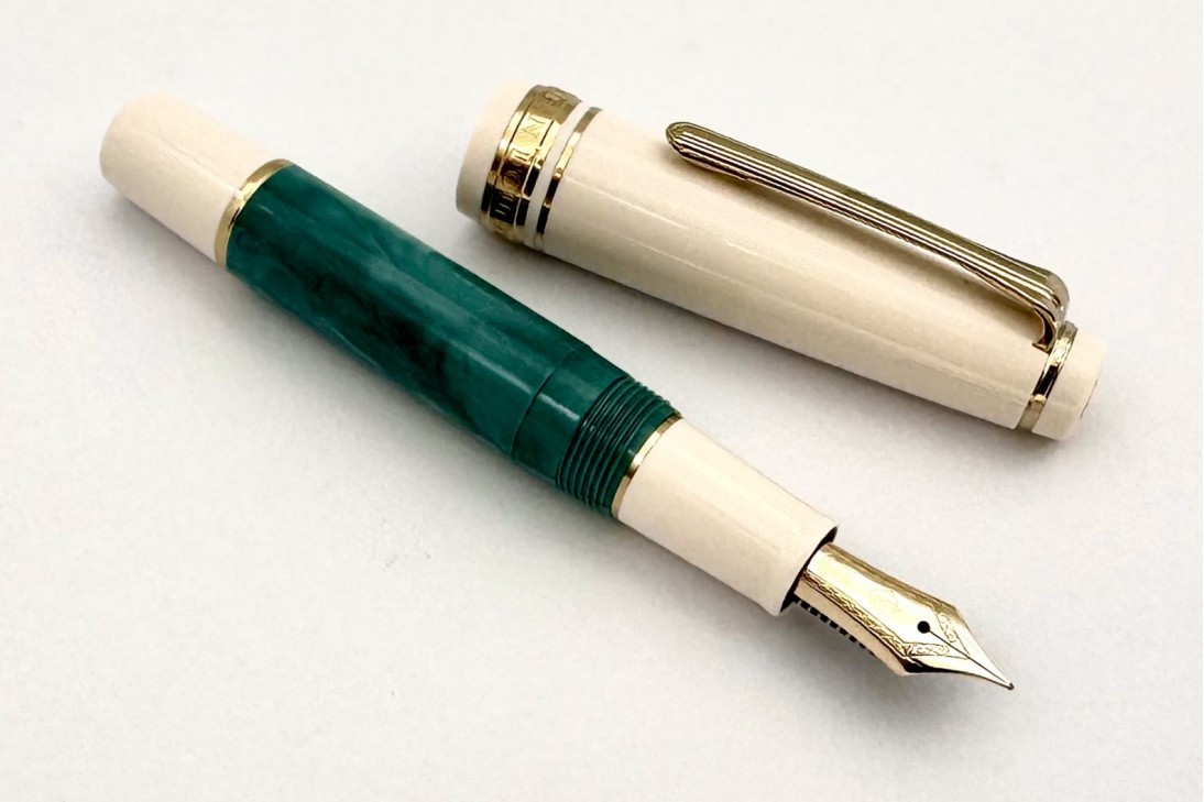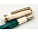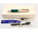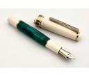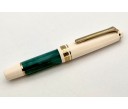 Sailor introduces a new look in its popular Slim Mini model with the Rencontre series. Featuring a marbled green resin body and a white cap and finial, and is complemented by gold-plated accents. The flat top cap features the Sailor anchor logo inset into the top finial.