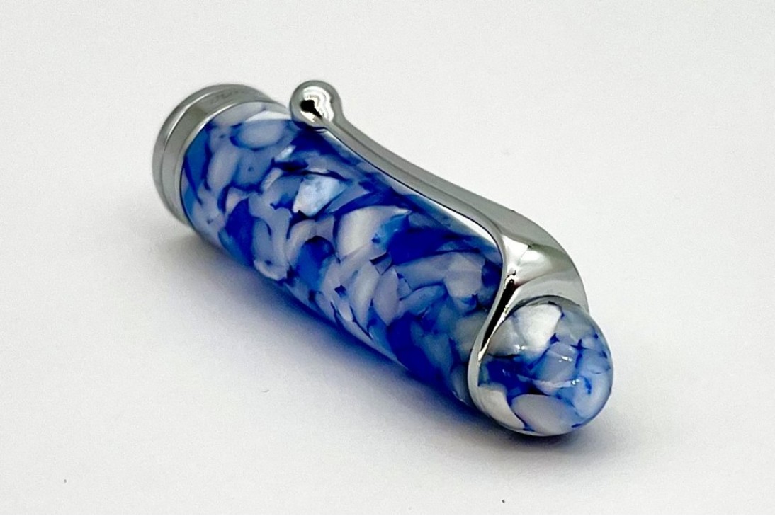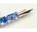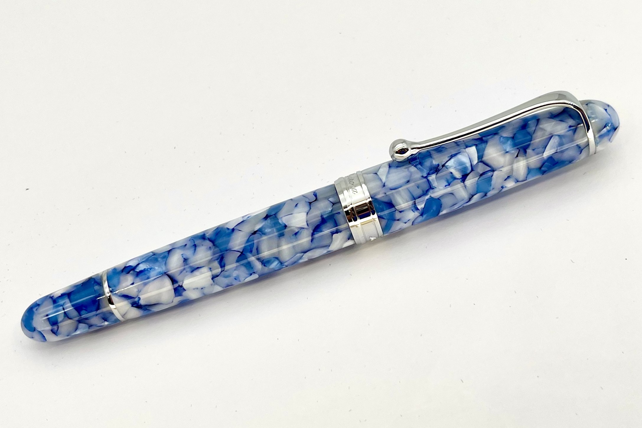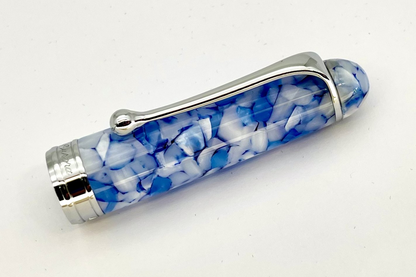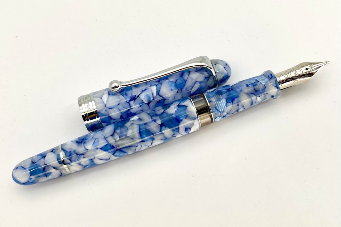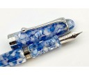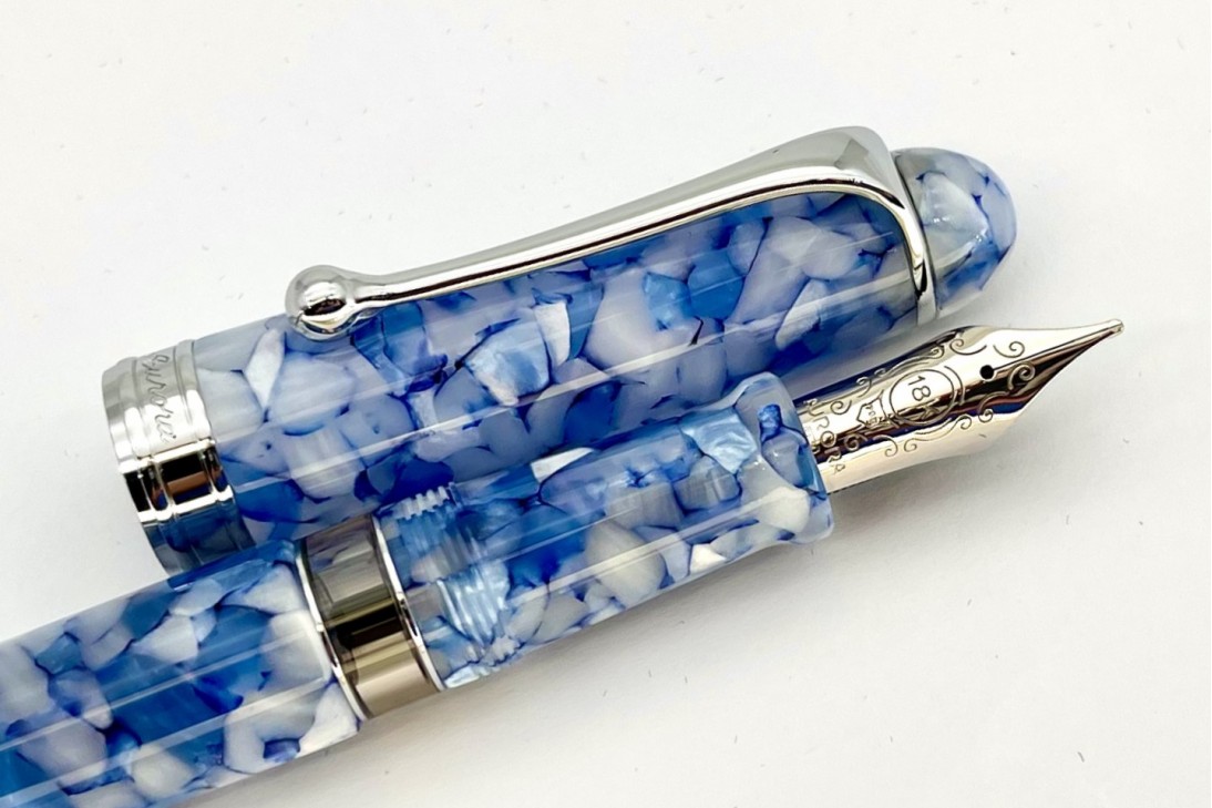 The fountain pen has a cap and barrel in turquoise and white Auroloide, with silver coloured trims and an 18 karat solid gold nib. It comes in a limited edition of only 888 numbered pieces.