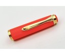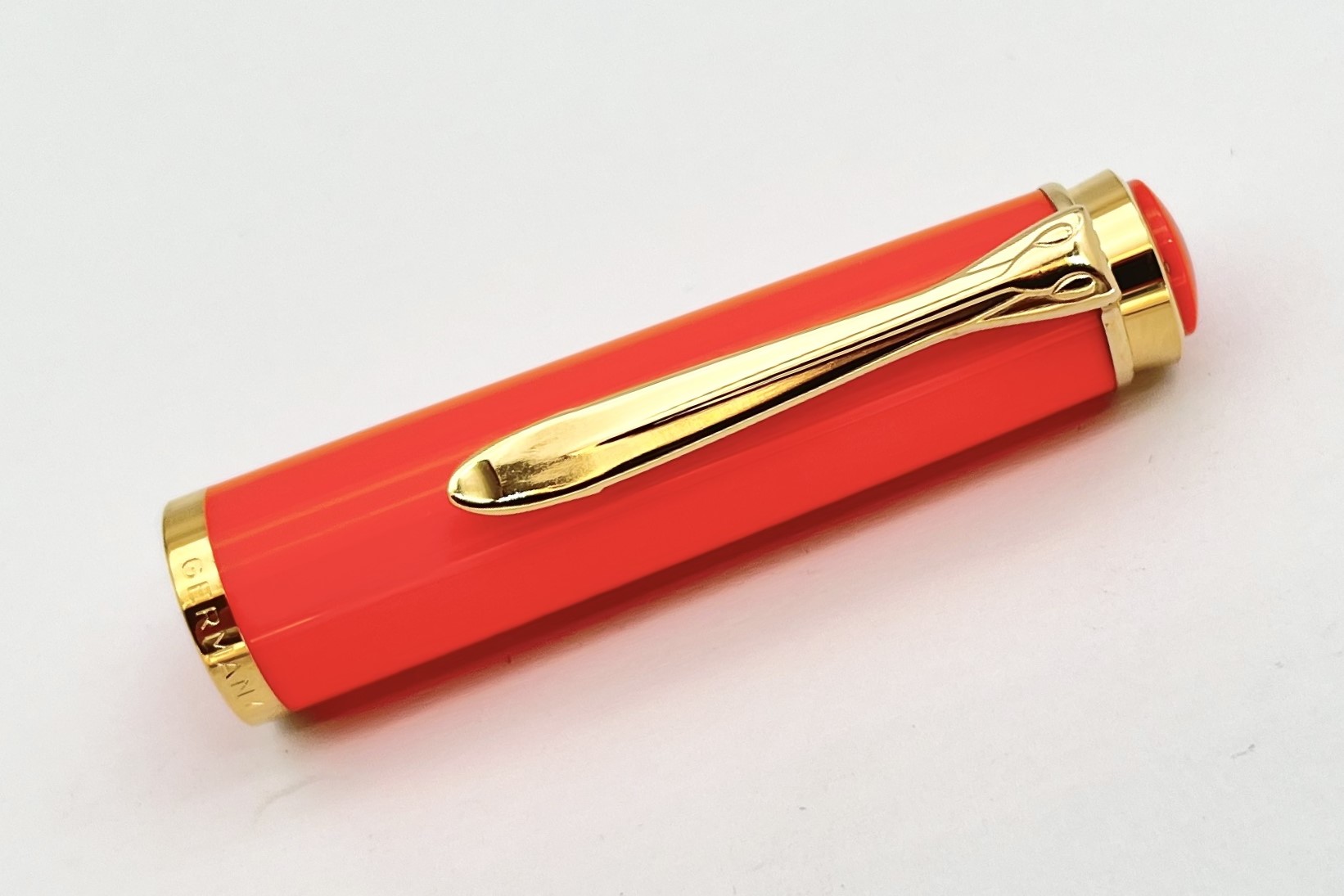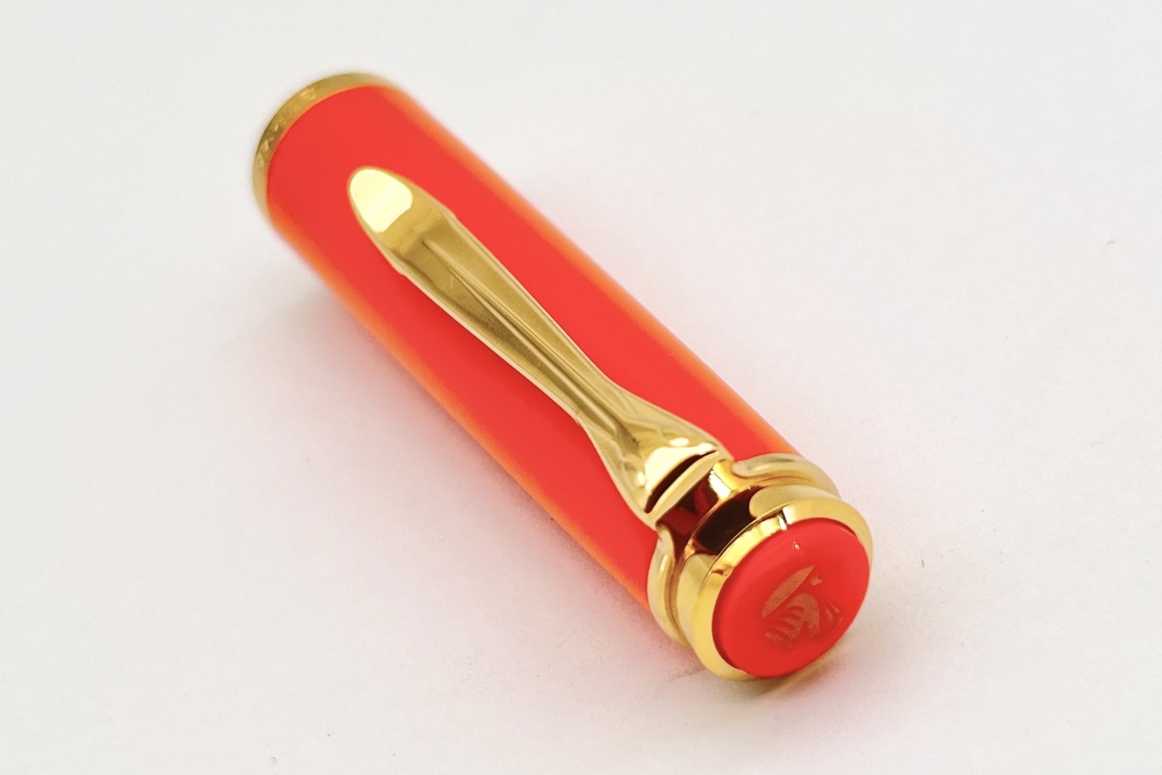The orange background of the golden Pelikan logo on top of the cap rounds off the impression of this intense color. The gold-plated rings and the Pelikan beak clip underline the showy orange fountain pen. This series is only available as fountain pen with piston mechanism.