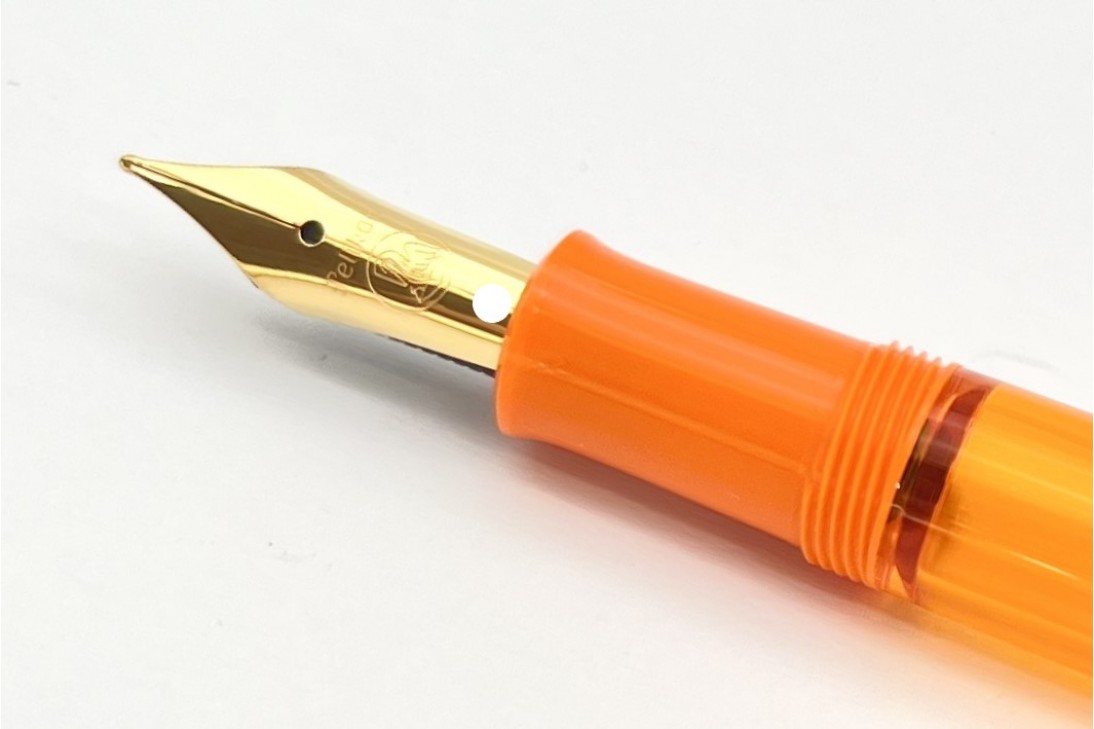 This series does not completely "reveal" its innermost being, but still shows a part of it. All high-gloss resin parts are orange, but the transparency of the pen body allows you to see the interior and the ink level. If desired, the cap can be posted on the back of the filling knob.