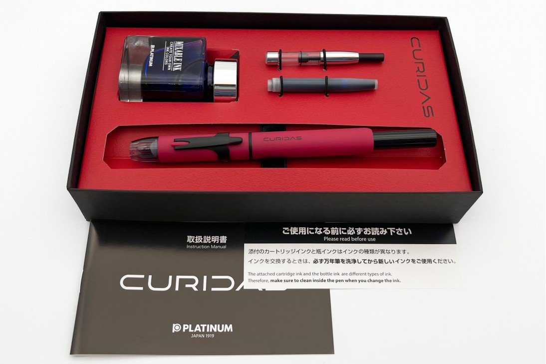 This limited edition package set includes a Platinum Curidas fountain pen in a steel nib, a 20ml bottle of ink, an ink cartridge, and a converter.