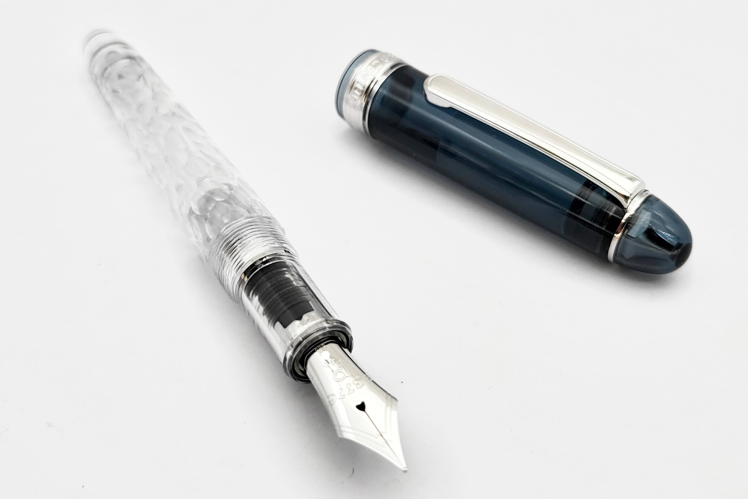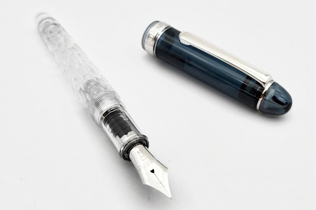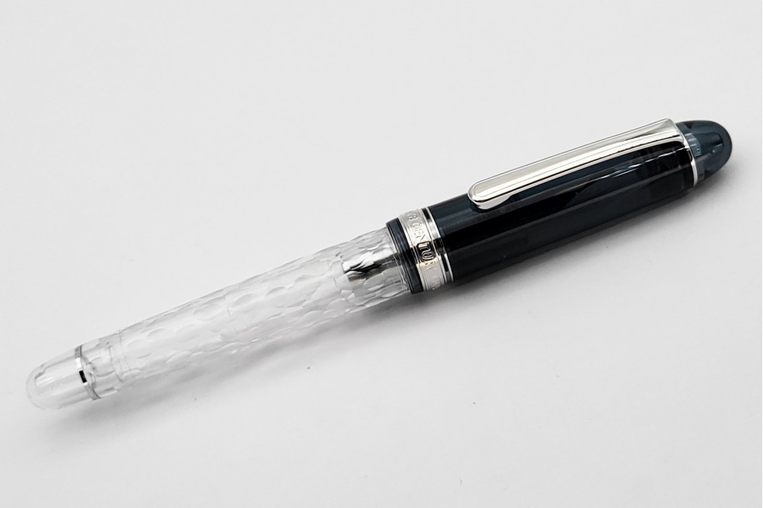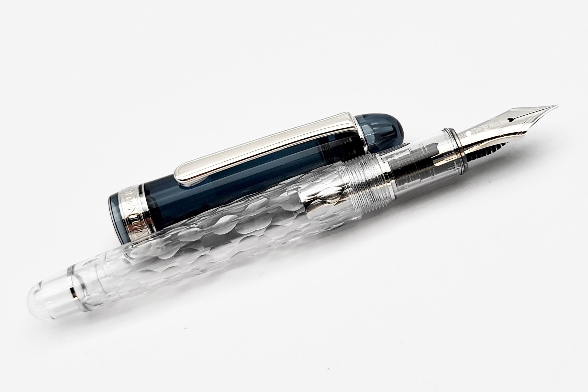 For the first time in the #3776 CENTURY series, the Uroko-Gumo fountain pen features a bi-coloured design, with different colors for the cap and body. The stylish dark blue-grey cap represents the surface of Mt. Fuji colored by seasons and time while the contrasting clear body features an intricately carved design.