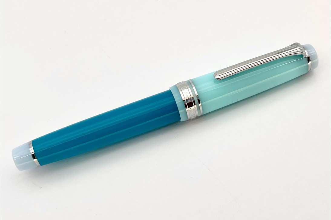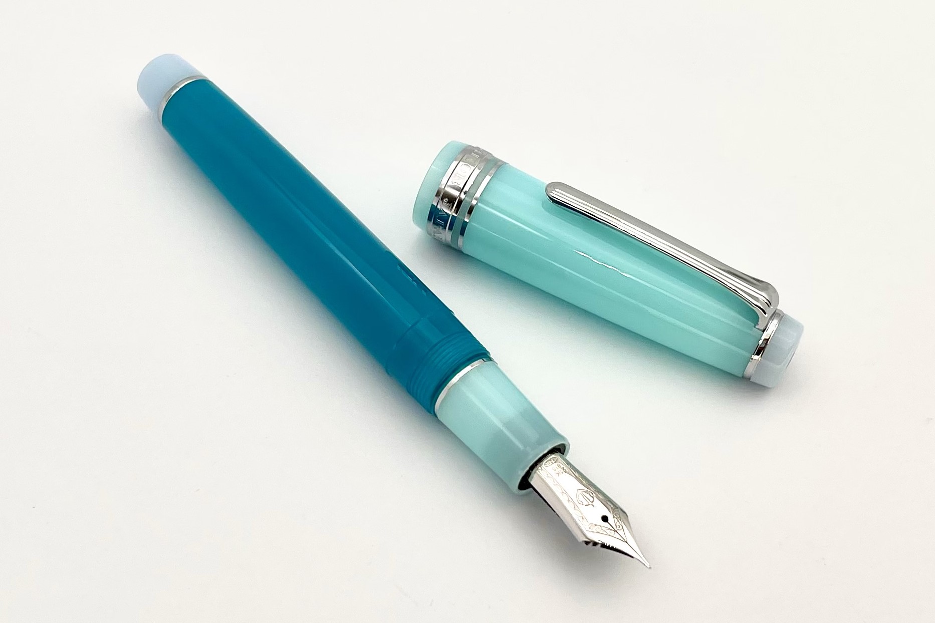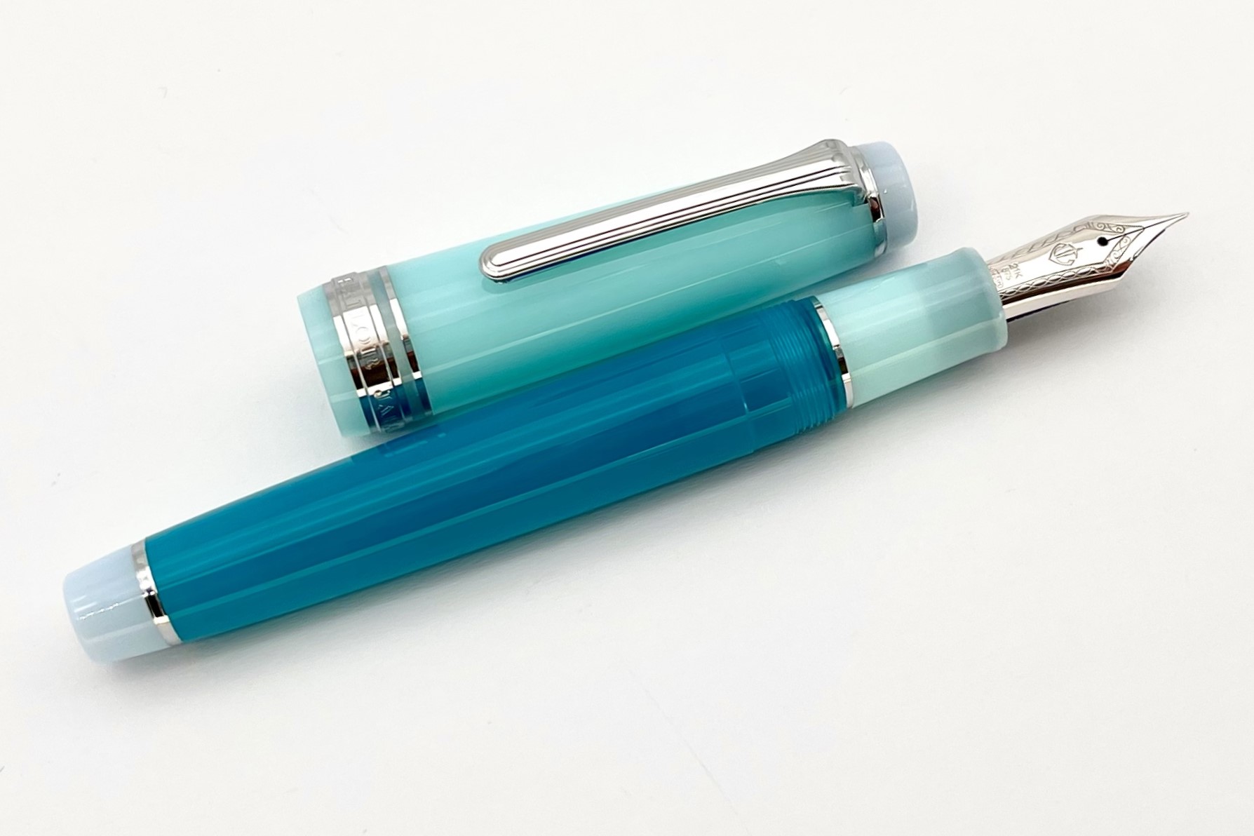Blue Margarita features two colors for body and cap, darker blue shade with a lighter shade of blue on the cap. Its 21 KT gold nib comes with the new Sailor logo and without "1911".