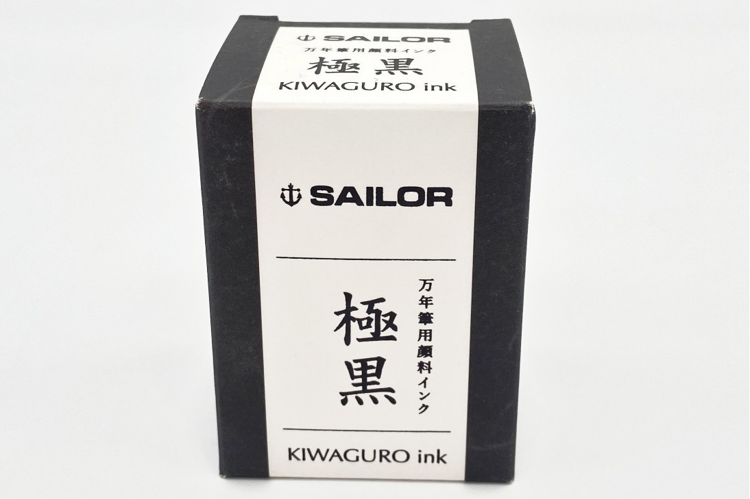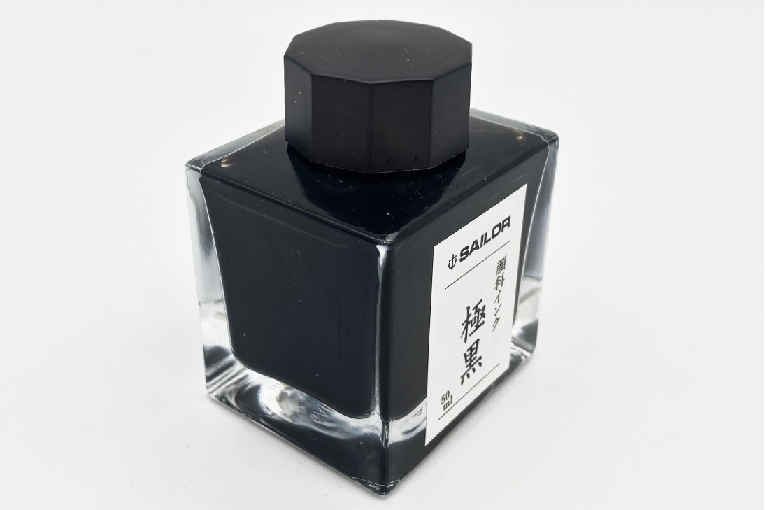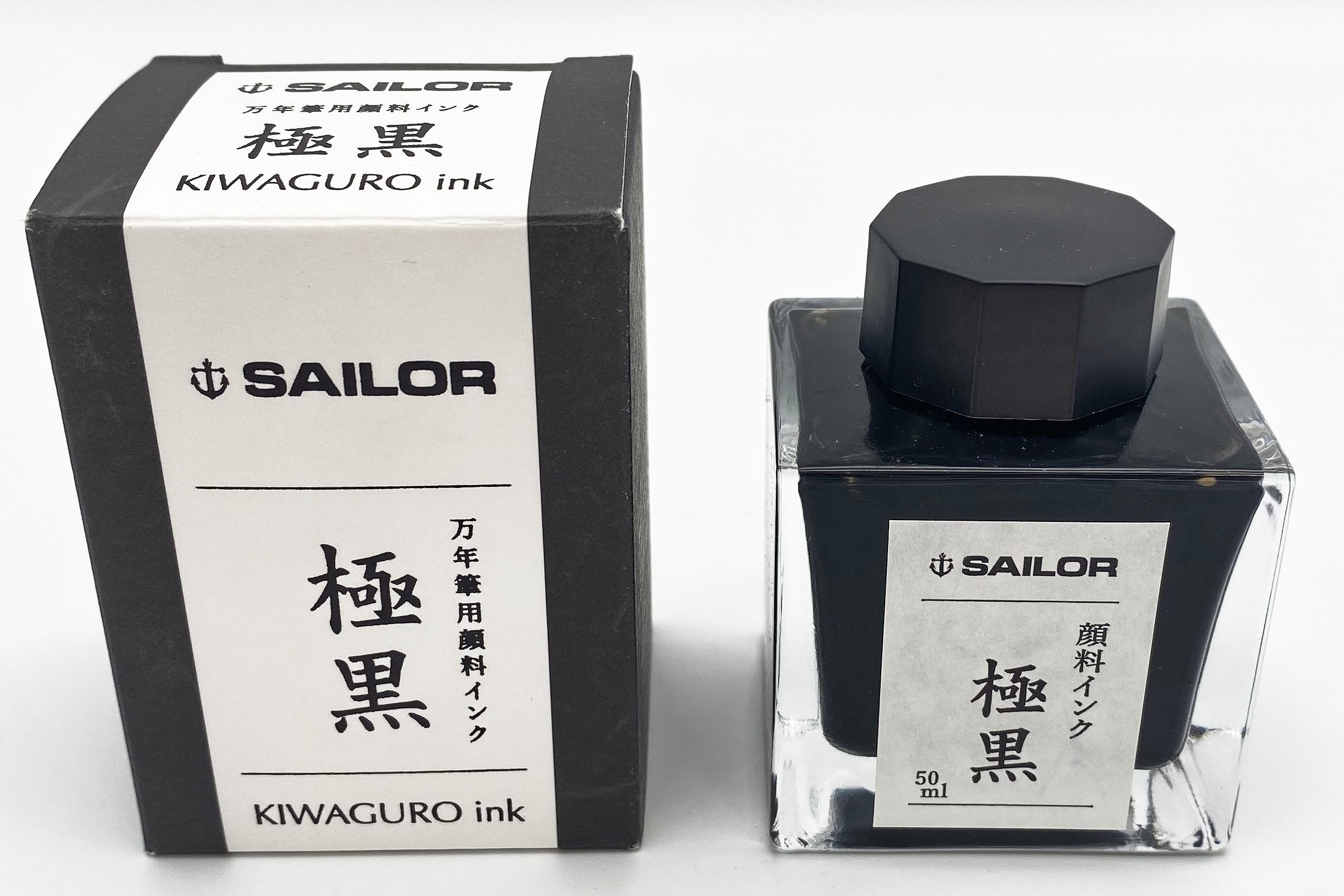 50ml square glass bottle of Sailor Kiwaguro Pigmented Black fountain pen ink. This pigmented black ink is a favorite of artists and sketchers for its water resistance.