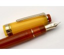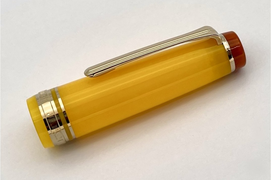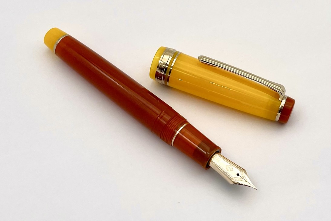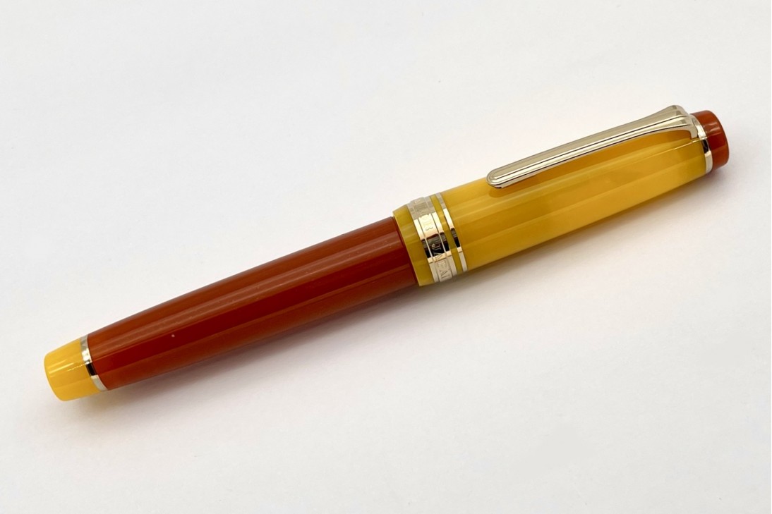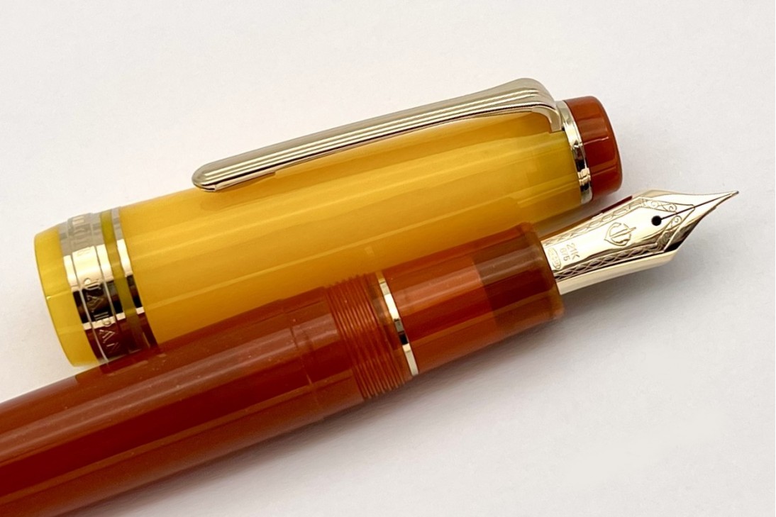 The Sailor Professional Gear fountain pen is equipped with a 21k gold nib. The cap screws to open/close and can push to post onto the back of the barrel when writing.