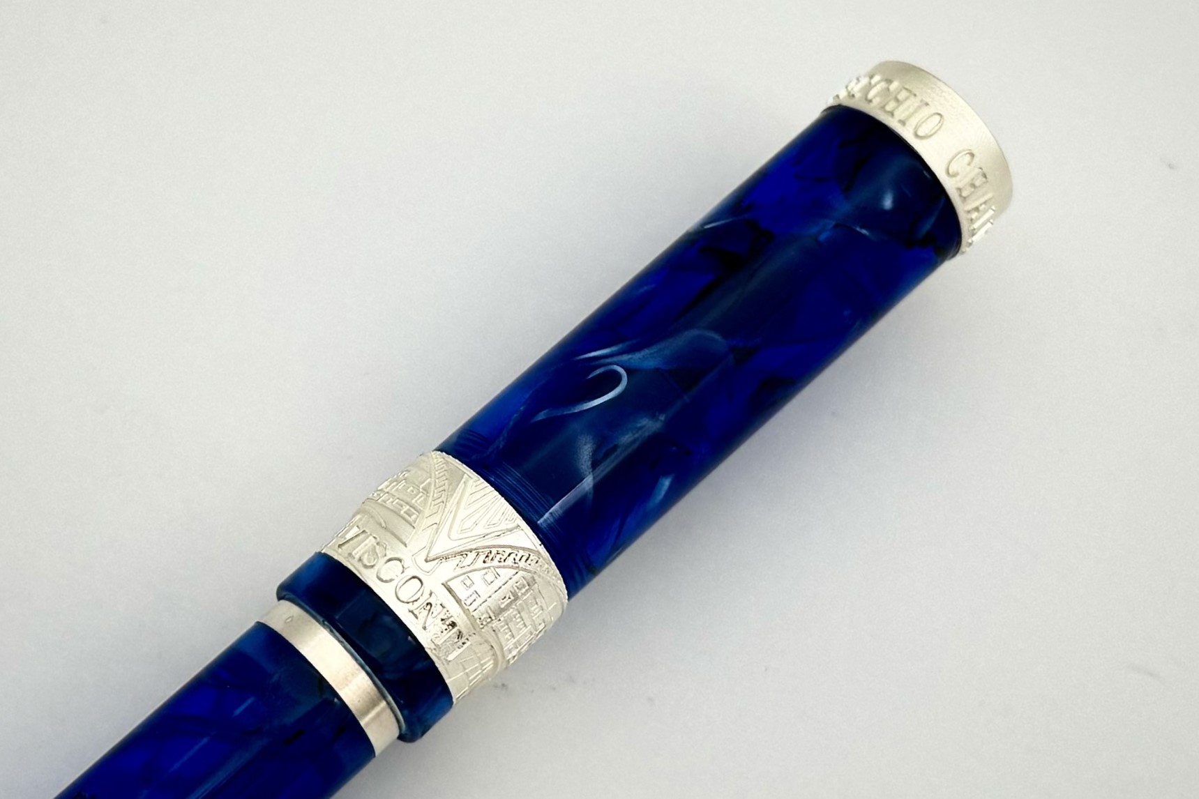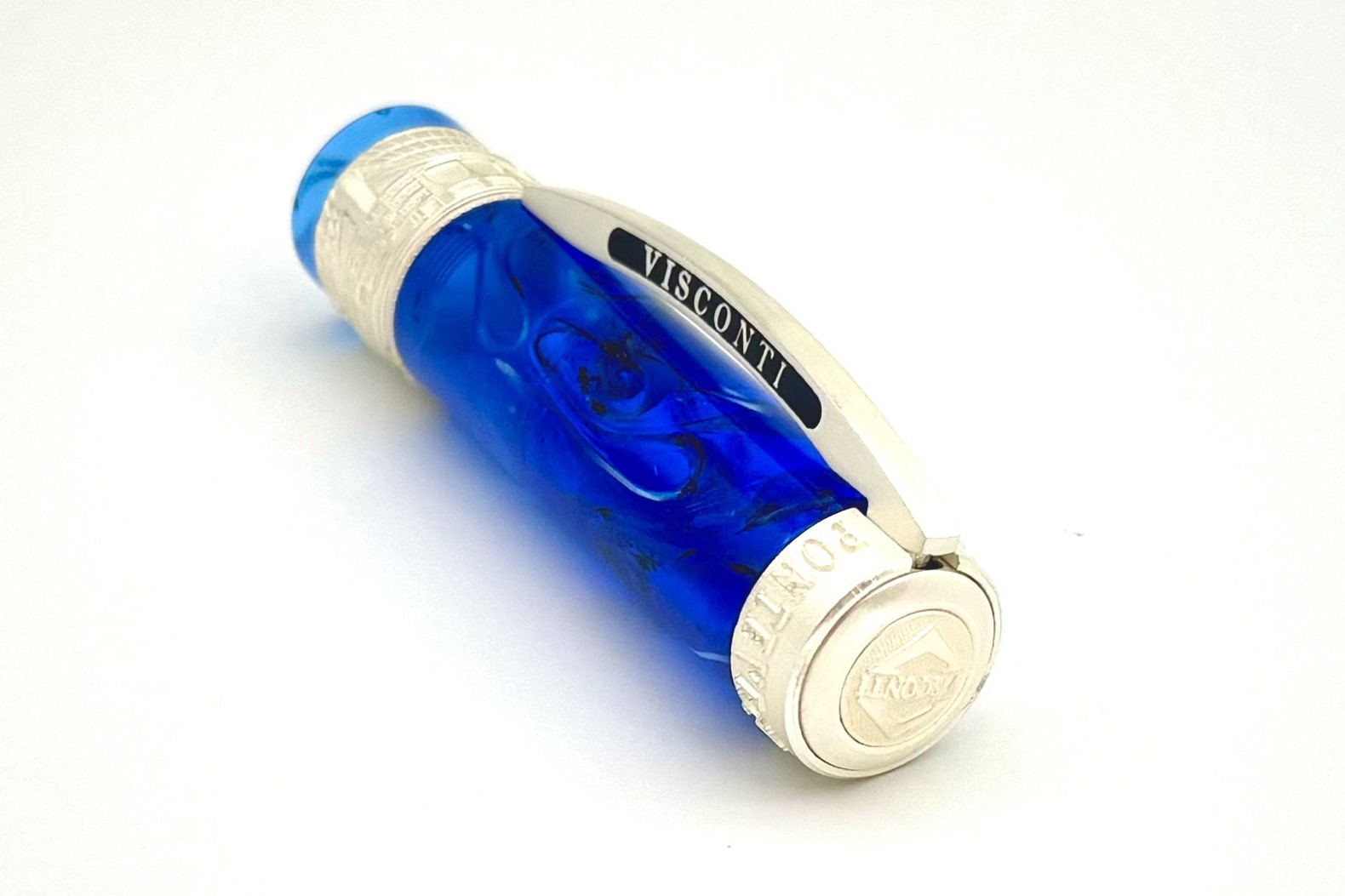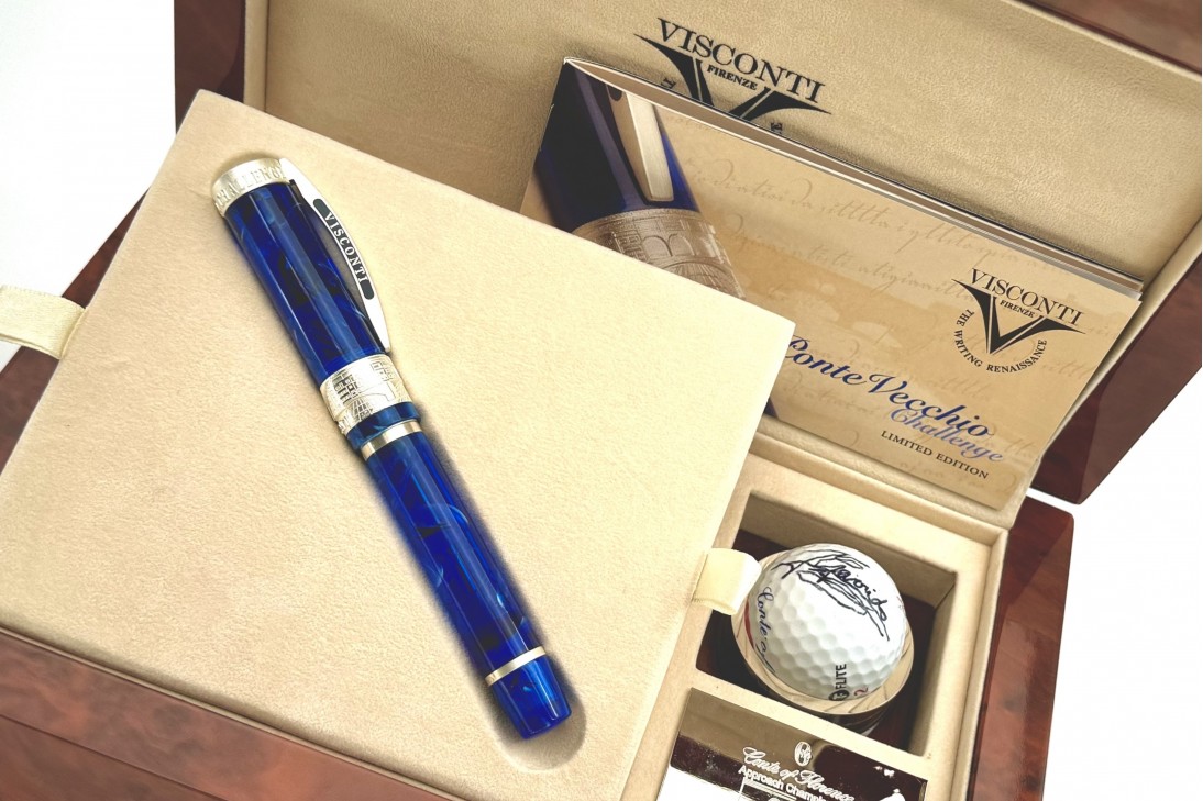 Visconti was a sponsor of the successful Ponte Vecchio Golf Challenge on December 16 & 17 of 2006, which took place in the setting of the famous Florentine bridge. As tribute, Visconti produced this limited edition of 118 fountain pens in transparent water blue acryloid. The bas-relief ring at the cap base reveals the details of the bridge and the ring at the cap top features the name of the event, and both are joined by Visconti's exclusive enamel-decorated bridge clip. View through the beautiful blue colour the patented double reservoir power filler, which supplies ink to the 18k gold nib. Each writing instrument is enclosed in precious briarwood package along with a golf ball which has been sank and signed by Ignacia Garrido, international golf master.