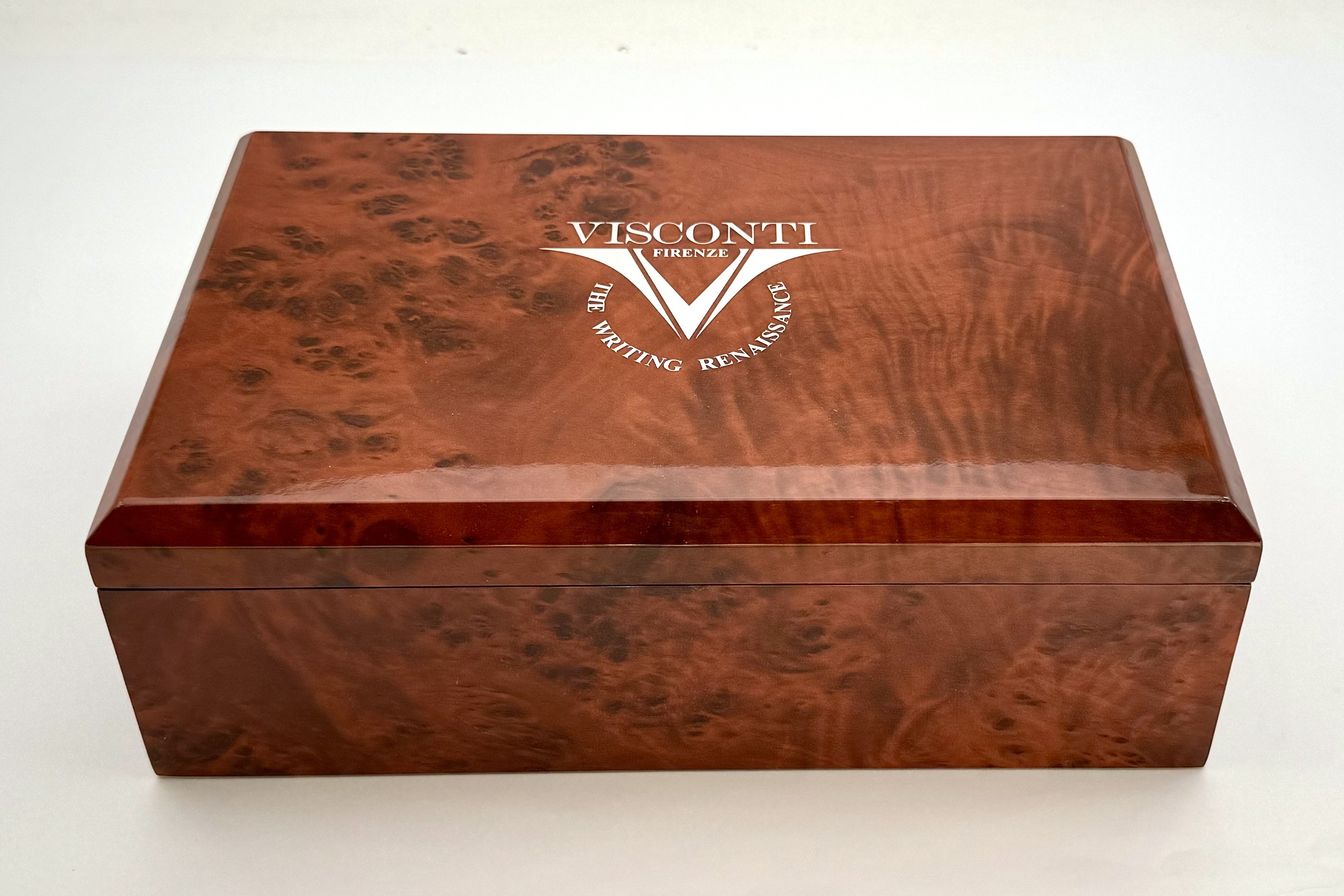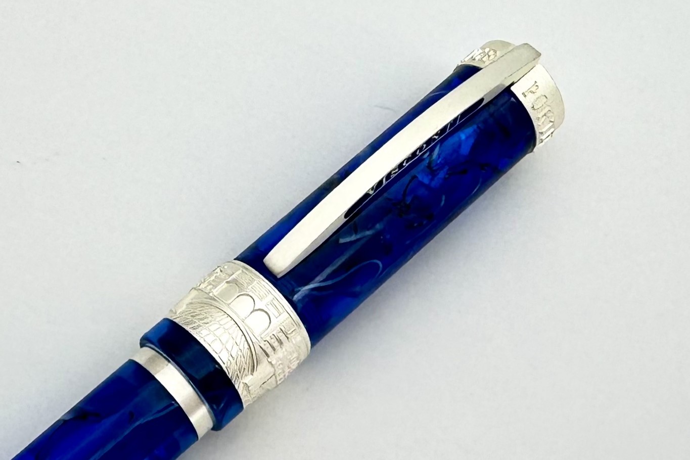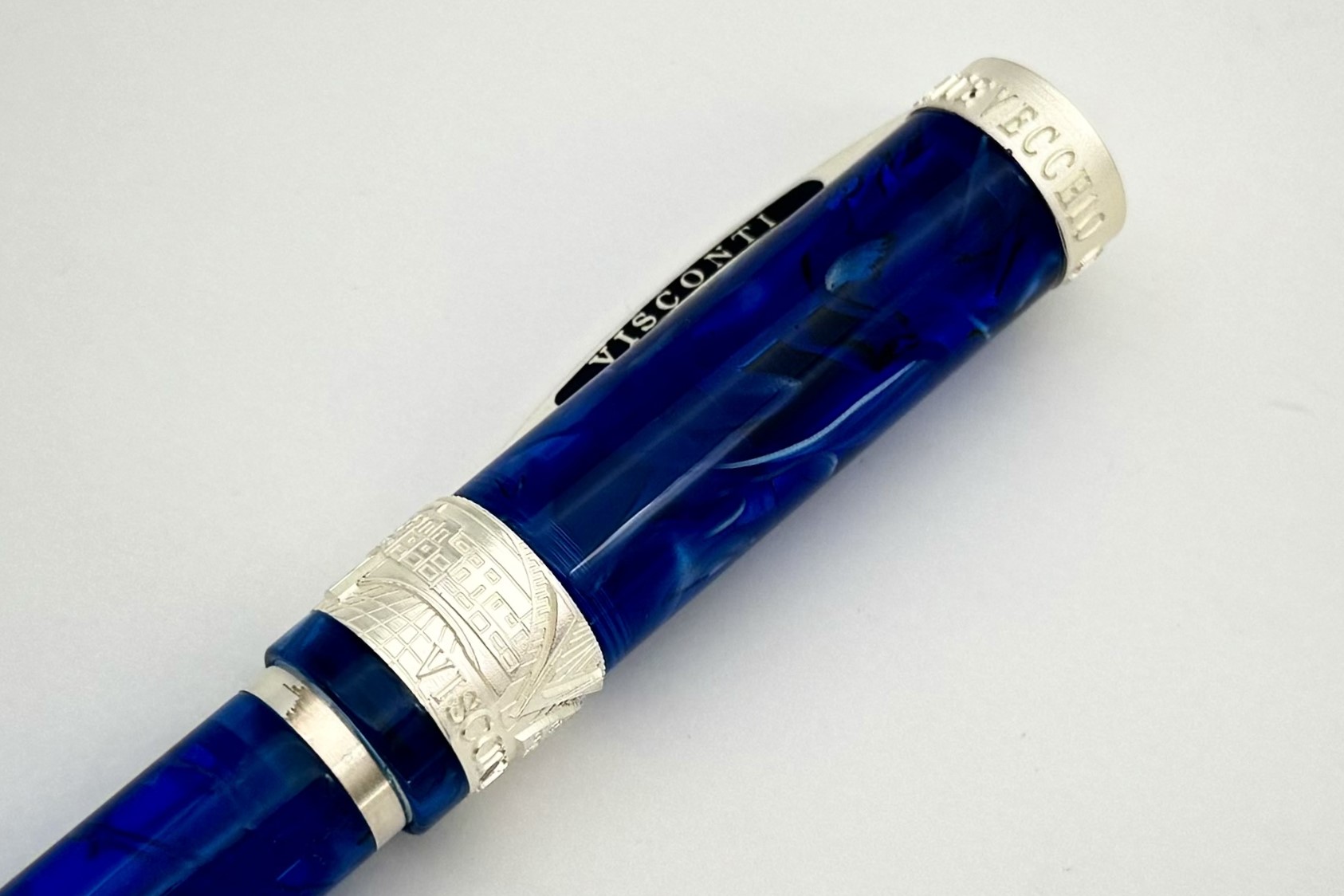 Visconti was a sponsor of the successful Ponte Vecchio Golf Challenge on December 16 & 17 of 2006, which took place in the setting of the famous Florentine bridge. As tribute, Visconti produced this limited edition of 118 fountain pens in transparent water blue acryloid. The bas-relief ring at the cap base reveals the details of the bridge and the ring at the cap top features the name of the event, and both are joined by Visconti's exclusive enamel-decorated bridge clip. View through the beautiful blue colour the patented double reservoir power filler, which supplies ink to the 18k gold nib. Each writing instrument is enclosed in precious briarwood package along with a golf ball which has been sank and signed by Ignacia Garrido, international golf master.